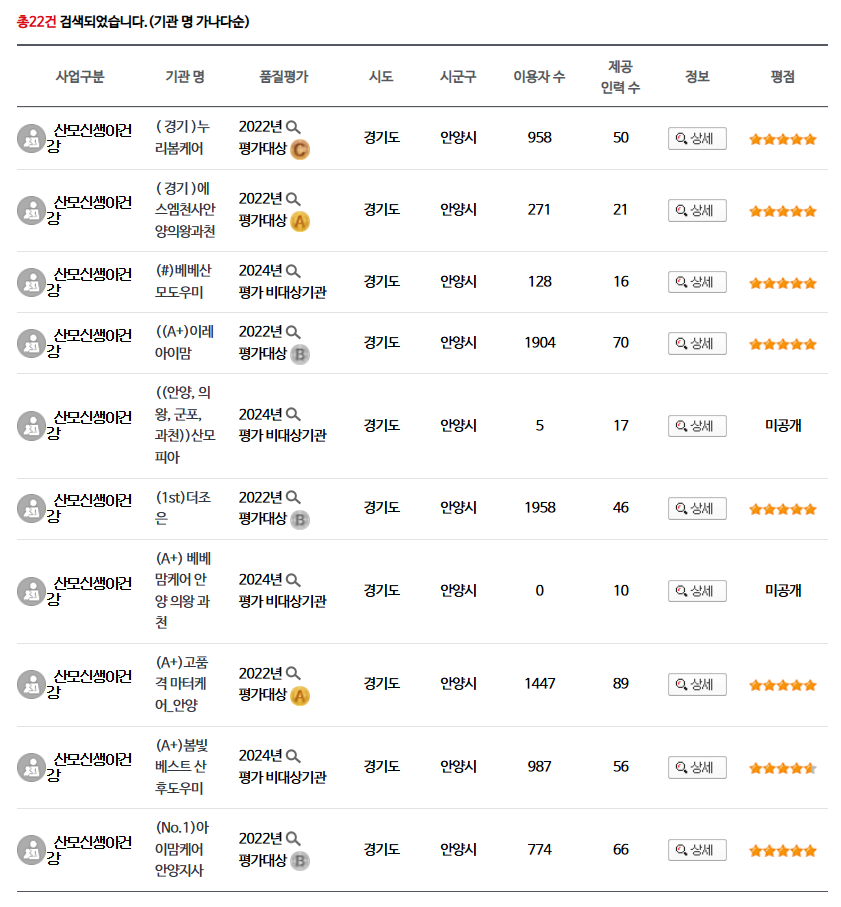 마음에 드는 업체의 상세버튼을 클릭하면 해당 업체에 대한 기본정보와 홈페이지주소, 사업실적, 제공인력 연령대, 경력기간 등을 볼수 있습니다.