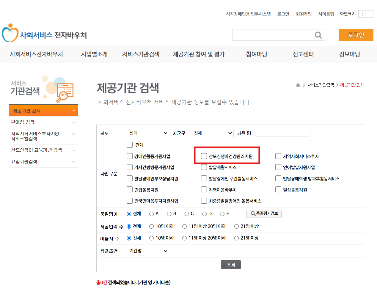 지역에서 해당하는 시군구를 선택하시고 '산모신생아건강관리지원' 탭을 선택합니다.