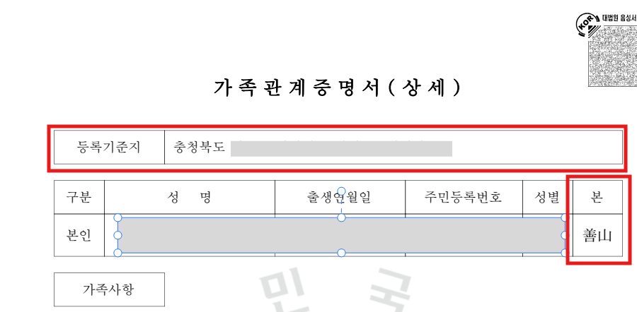 가족관계 증명서를 발급받으면 등록기준지와 본(한자)를 확인할 수 있습니다.