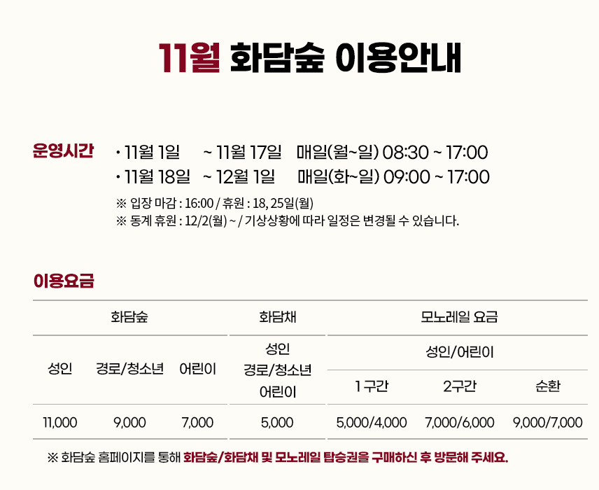 - 입장 제한 : 방문객 수가 일정 수를 초과하면 입장이 제한될 수 있으므로, 특히 단풍철에는 서둘러 예약하는 것이 좋습니다.